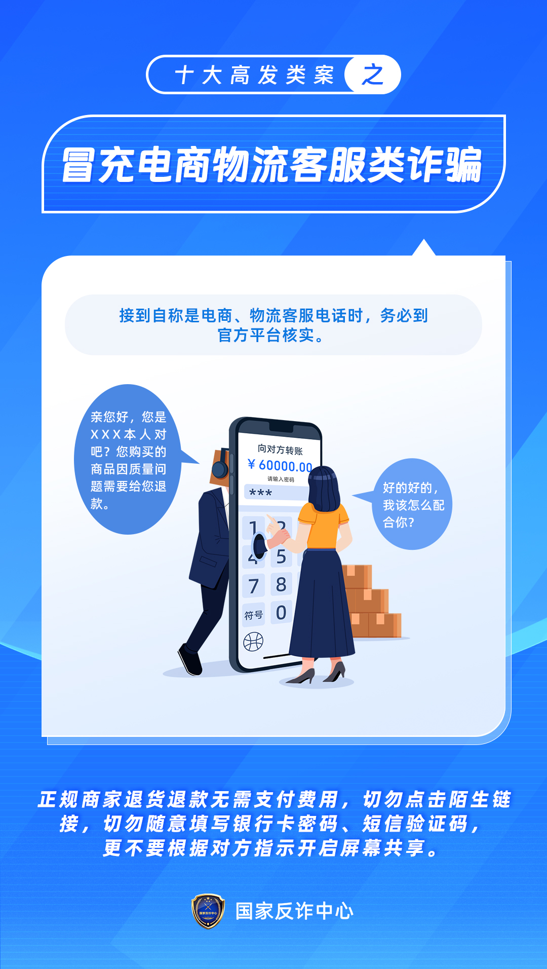 十大高發(fā)類案之冒充電商物流客服類詐騙 發(fā)布時間:2023年07月04日 08時50分 作者:管理員 來源:本站 上一條:十大高發(fā)類案之虛假網(wǎng)絡貸款類詐騙下一條:十大高發(fā)類案之冒充公檢法類詐騙